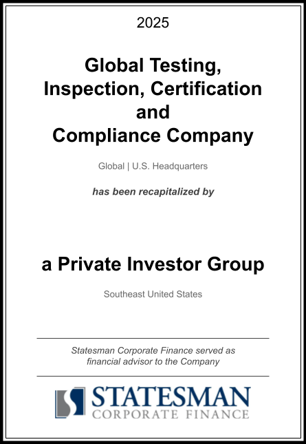 HOUSTON, TEXAS (December 16, 2025) – Statesman Corporate Finance, LLC (“Statesman”) is pleased to announce the majority recapitalization of a global testing, inspection, certification and compliance company (“the Company”). Statesman served as the exclusive financial advisor to the Company on this transaction. The Company provides mandated safety- and compliance-oriented services for offshore vessels, platforms and other marine infrastructure.